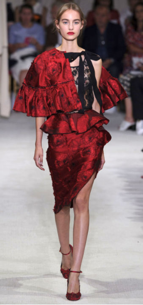 OSCAR DE LA RENTA Peter Copping, the current designer for Oscar De La Renta, had laid out red carnations on gold ballroom chairs with pink cushions intending to create a show designed with Oscar’s love of carnations as well as working them into the show.